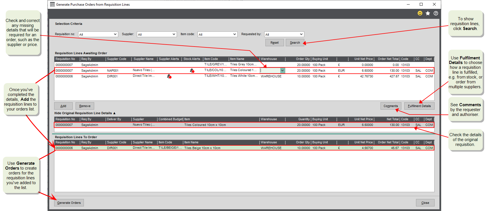 - The quantities from requisition lines will be combined in a single order if they have the same Item Code and are ordered from the same Supplier.