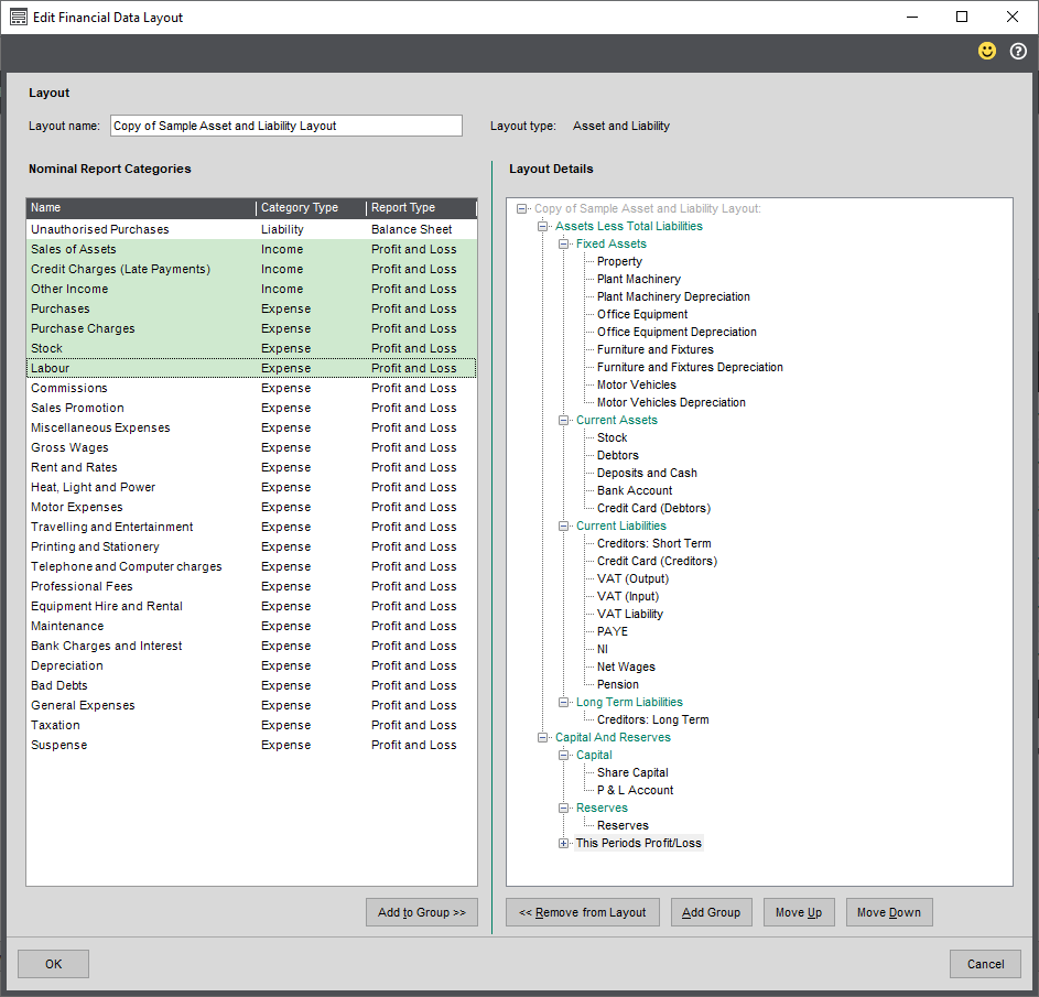 • Ensure that you set up category codes for your nominal accounts, so that they have the appropriate Report Type and Category Type for the type of layout. To do this, see Report category codes.