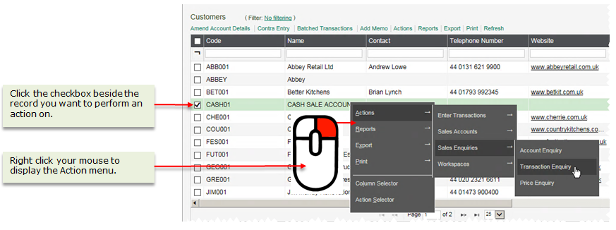 Certain actions and tasks must have a specific row or rows selected, using the check box to the left of the row. This is because you have to specify a record before you can open certain windows. For example, you must choose a bank account before you can add a memo. In the same way, you have specify certain records before you can print or export selected records.