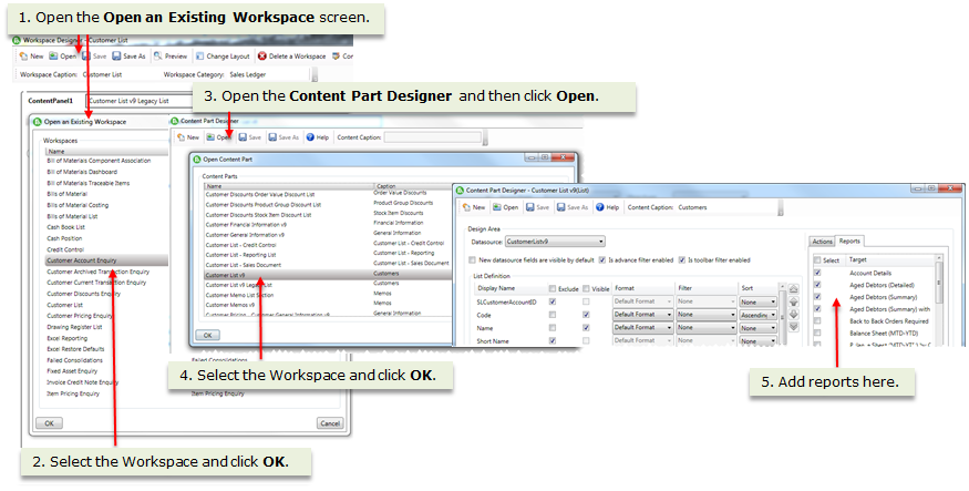 Each workspace has a set of reports defined in the content part. The default workspaces each has a set of reports available 'out of the box'. You can add or remove reports from a content part using the Workspace Designer.
