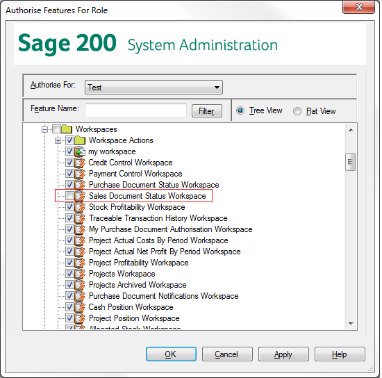 As with other Sage 200 windows, each workspace has a feature defined in System Administration. To access a workspace, you must have the feature enabled for your role.